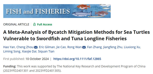 近日,304永利集团万荣教授课题组联合美国夏威夷太平洋大学、北卡罗莱纳州立大学以及远洋渔业科学与技术战略创新团队等研究人员在揭示海龟兼捕减缓方法有效性研究方面取得新进展,该成果以《A meta-analysis of bycatch mitigation methods for sea turtles vulnerable to swordfish and tuna longline fisheries》为题发表于渔业领域顶级期刊《Fish and Fisheries》(doi: 10.1111/faf.12865)。304永利集团2023级硕士研究生严浩为论文第一作者,万荣教授和周成副教授为共同通讯作者。该研究得到了国家重点研发计划(2023YFD2401301和2023YFD2401305)的支持。