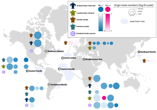 作为环境敏感型物种(ESS),海龟长期面临栖息地破坏、气候变化、海洋污染和渔业误捕等多重威胁。其中,赤蠵龟(Caretta caretta)、棱皮龟(Dermochelys coriacea)、太平洋丽龟(Lepidochelys olivacea)和绿海龟(Chelonia mydas)与延绳钓渔业活动的交互尤为显著,导致兼捕问题成为全球可持续渔业面临的一大挑战。尽管在全球范围内已经相继开发出各种减少兼捕的方法,然而这些技术在跨物种和区域间的有效性,以及多种措施联合使用时的协同效应尚不明确。