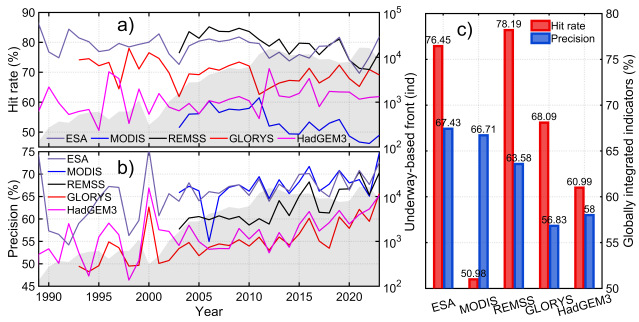 锋面识别算法能够基于卫星观测的海表环境信息自动提取锋面信息,是目前获取和监测区域及全球锋面活动的主要手段。然而,其识别结果的可靠性是多学科研究应用的基础,易受算法性能与卫星数据质量等因素影响。长期以来,缺乏系统的原位观测对其准确性进行验证评估,限制了识别算法在多学科领域的广泛应用。此外,当前常用的多种海表数据产品(如单卫星、多卫星融合和再分析数据)在锋面识别结果上存在显著差异,亟需系统评估以为相关研究提供指引。