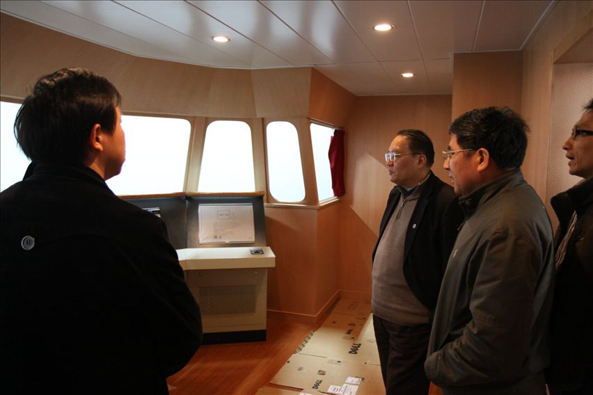 潘董事长听取了海洋科学公司经理许柳雄、副经理陈新军对远洋渔业实习基地施工、布置进展的详细汇报,并饶有兴趣的查看了刚刚安装好的NTPRO 4000型渔船操纵与捕捞作业模拟器。潘董事长仔细询问了各类设备的安装进展情况,详细了解各种设备的功能,并对整个楼层的布置提出了宝贵的意见。