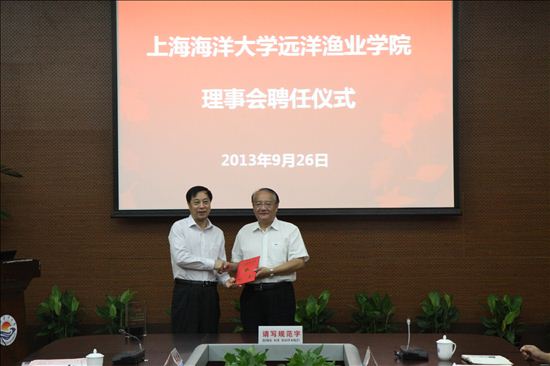 潘迎捷董事长给远洋渔业公司理事会理事长赵兴武颁发聘书。随后,赵理事长为远洋渔业公司理事会副理事长和理事颁发了聘书。