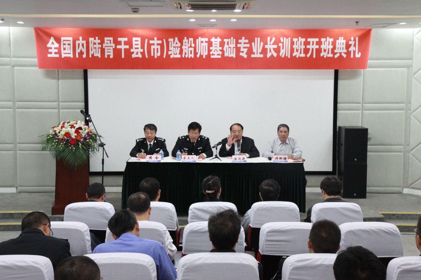 潘捷董事长在讲话中对于本次到来的39名学员表示了热烈的欢迎,同时感谢部局领导对公司的帮助、支持和信任。表示公司将计划建成检测车间和远洋渔业船员实训基地,为验船师培训能力的提升提供一个良好的平台,并通过和企业以及船检局的合作,更好的加强公司服务社会的能力。来自吉林的学员代表在发言中表达了对部局以及公司的感谢,并代表全体学员保证端正学习态度,转变角色,严守纪律,切实保证培训效果,克服各种困难,认真完成培训任务。