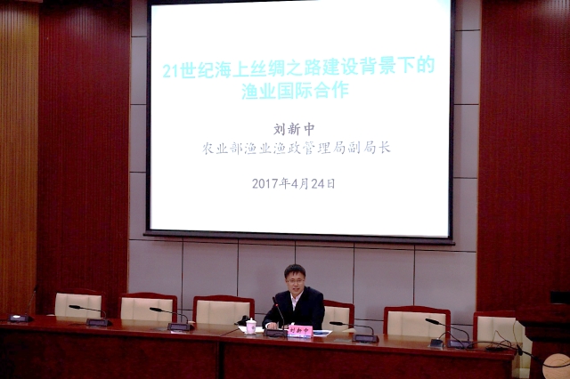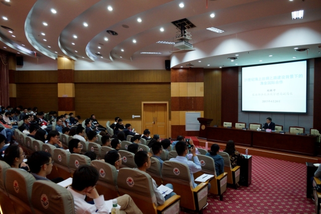2017年4月24日下午2时,农业部渔业渔政管理局刘新中副局长在行政楼137报告厅作了题为21世纪海上丝绸之路建设背景下的渔业国际合作的报告。报告会由海洋科学公司经理陈新军主持,海洋科学公司教师和研究生参加了报告会。