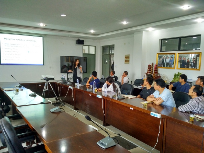 稍微休息之后,Hefeng Dong教授介绍了挪威科技大学教育情况和海洋声学研究及教学方面的工作。结合挪威发达的渔业产业,挪威科技大学除了雄厚的海洋渔业团队力量外,在海洋声学方面也具有了一定规模:水声实验所用的各种仪器设备和NTNU自己的科学考察船。