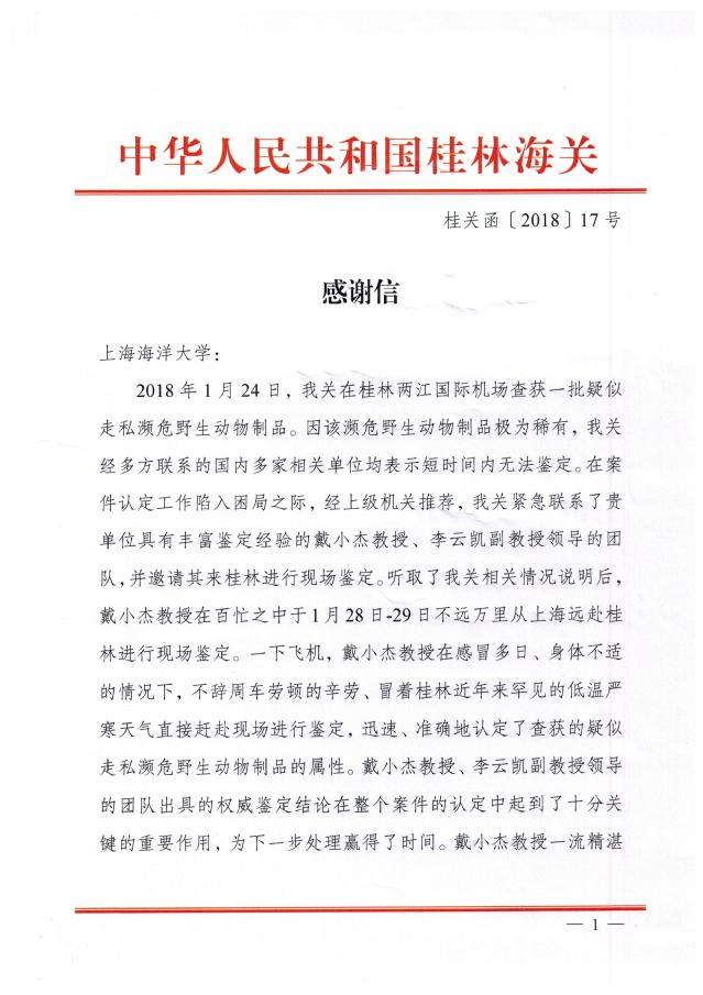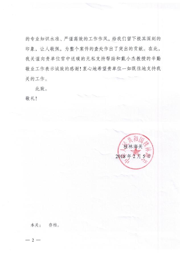 近日,中华人民共和国桂林海关发来感谢信,对公司戴小杰教授、李云凯副教授领导的团队表示感谢。