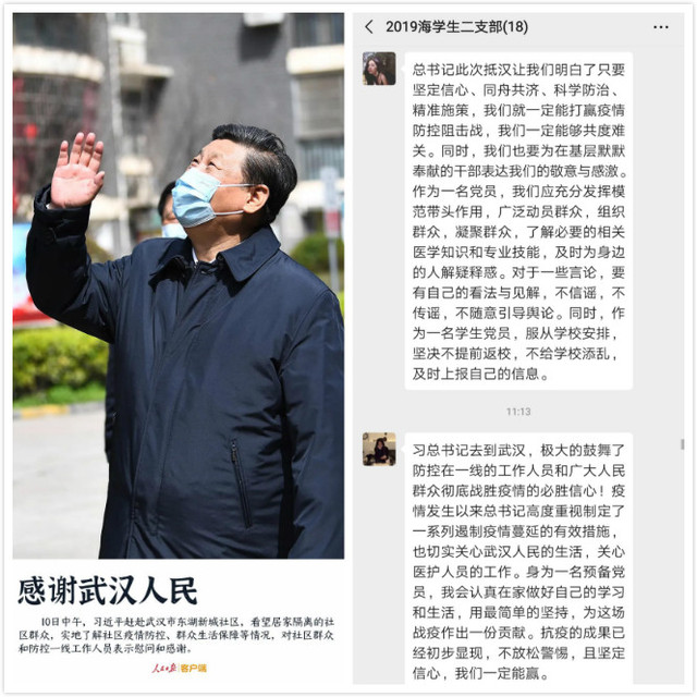 2018级海资2班团支书应佳雯说道:“这次疫情发生以来,武汉首当其冲,成为了战疫的决胜之地,总书记来到了武汉,来到了战疫最前线,带来的是全国人民的慰问,提振的是一线将士的士气,体现的是党和政府始终心系湖北人民,坚决打赢疫情防控阻击战的鲜明态度和坚定决心。让我印象深刻的是总书记在武汉考察时的讲话既暖心又直抵人心,对于逆行的医务工作者,总书记说他们是光明的使者,希望的使者,是最美的天使,是真正的英雄,党和人民要给他们记头功。武汉,这座经历了一次次重大历史考验的城市,正开展着与病魔的斗争。作为一名老员工,我虽然没有能力像医务工作者一样请战奔赴一线,但是我能从小事做起,做好个人和家人的防护工作,关注疫情的实时进展,为身边人科普疫情防控知识,杜绝传播虚假信息,不传谣不造谣不信谣,既要提高意识又要避免过于恐慌。经历过这次疫情,我更能意识到责任和义务的重要性,我相信,在习近平总书记的带领下,疫情很快就能结束,我们也终将迎接胜利的曙光!”