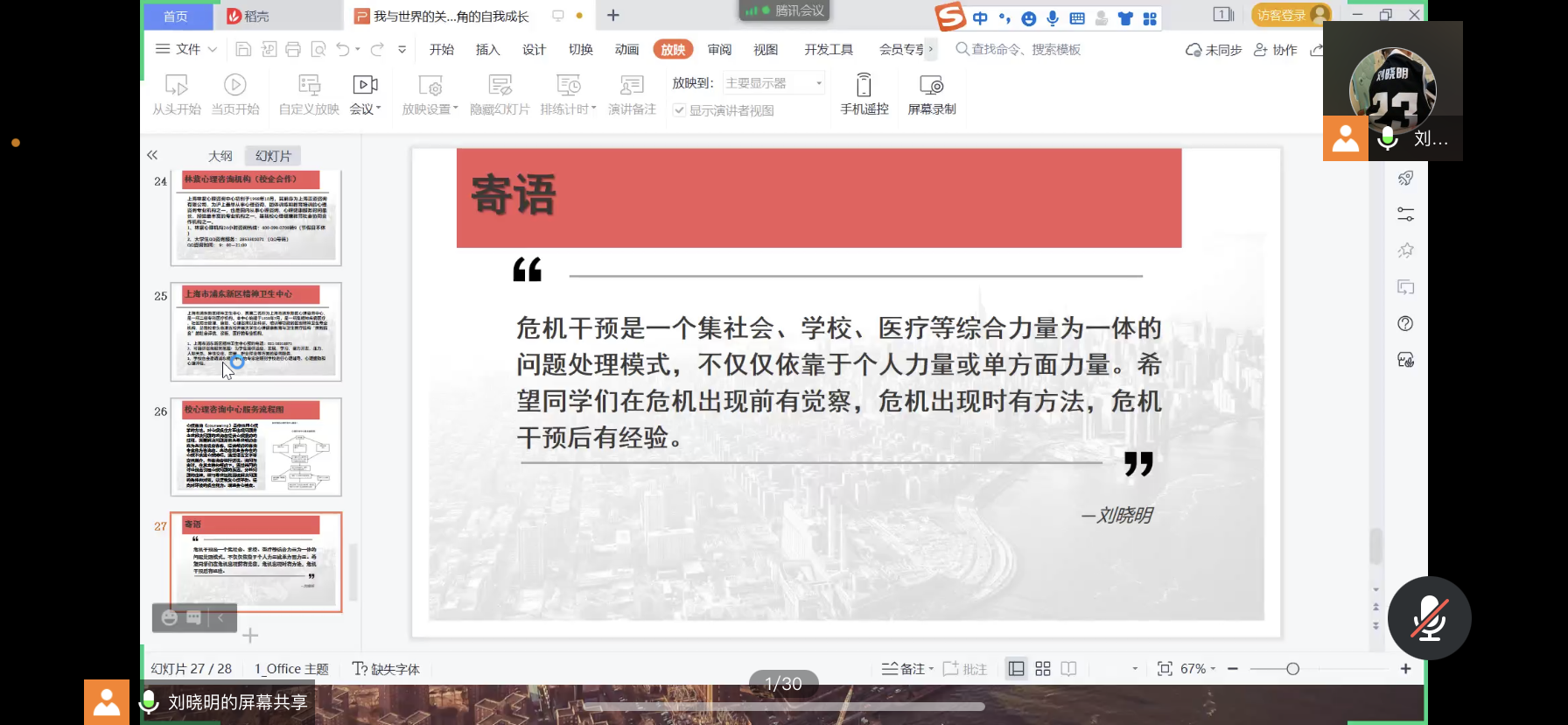11月23日,为进一步提高公司全体本科生和研究生的心理素质,促进老员工的身心健康和谐,宣传普及心理健康知识,深入开展心理健康教育,公司邀请了心理健康教师刘晓明为公司员工线上开展了“我与世界的关系——心理学视角的自我成长”讲座活动,参与本次讲座的为海洋科学公司2021级、2020级研究生及部分本科生。