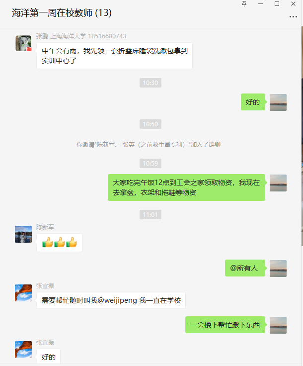 根据上海市疫情防控工作统一要求,公司于3月13日12点正式启动校园准封闭管理。海洋科学公司第一时间响应,院领导带头,值班老师积极参与,并建立留校值守教职工联系群,千方百计为留校值守教职工做好保障工作,解决教职工的后顾之忧。
