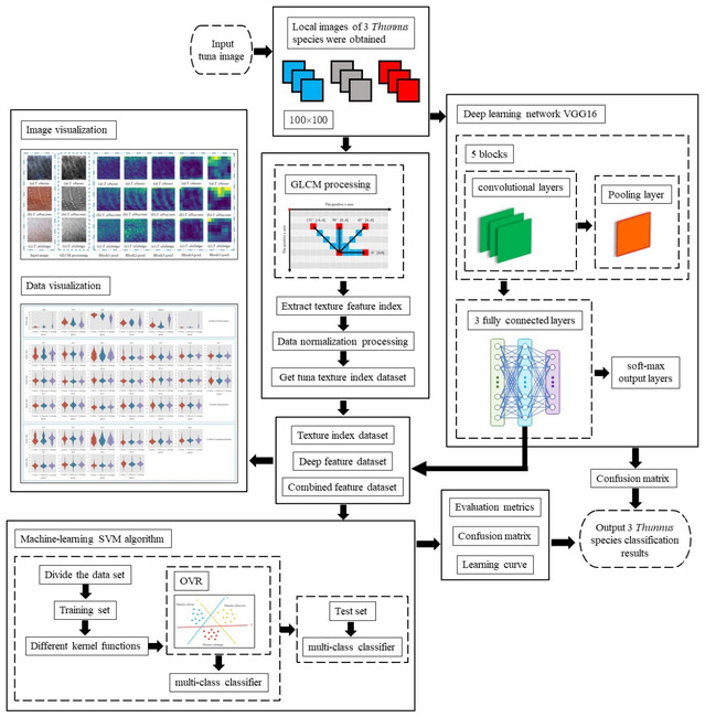 论文根据中国远洋渔业数据中心观察员、以及远洋渔业调查中心“淞航号”号开展农业农村部公海渔业资源综合科学调查专项所收集的金枪鱼图像(图1),通过计算机视觉技术对金枪鱼表型纹理信息进行多样化可解释性处理和利用不同核函数SVM算法进行性能分析等(图2),进而得到金枪鱼表型纹理信息智能化识别结果(图2-图3)。