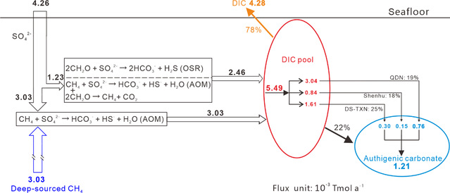 图3. 南海北部海底碳和硫循环过程和自生碳酸盐形成效率。南海北部自生碳酸盐形成效率在22%左右。AOM:甲烷厌氧氧化作用;OSR:有机质硫酸盐还原;DIC:溶解无机碳
