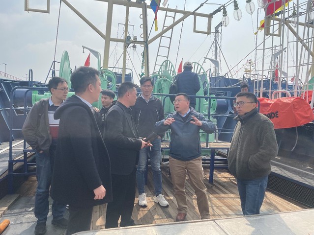 会议最后,项目一行前往舟渔码头进行实地调研。项目课题组考察了在港鱿钓船和金枪鱼渔船的情况,询问了船载卫星、船联网等各类设备安装情况,为后续开展船上试验和设备安装奠定了基础,保障了2024年度项目实施。