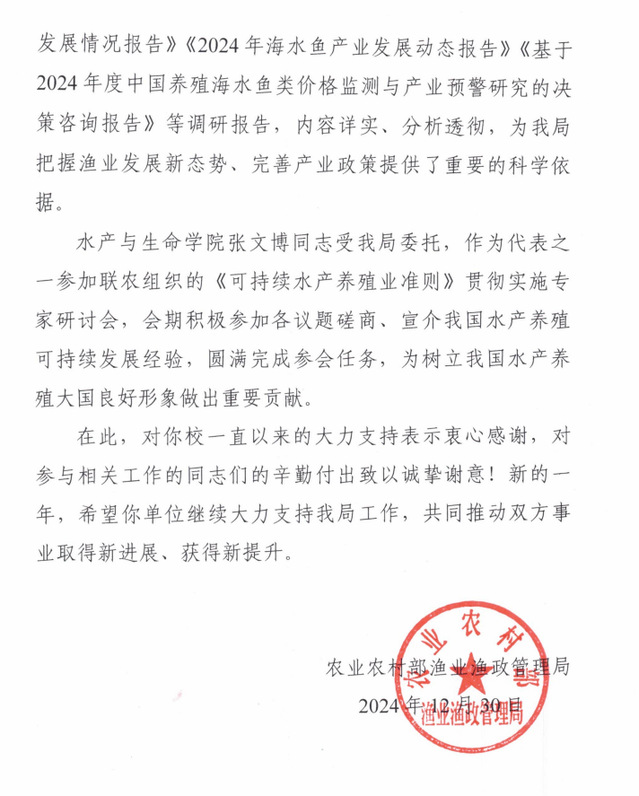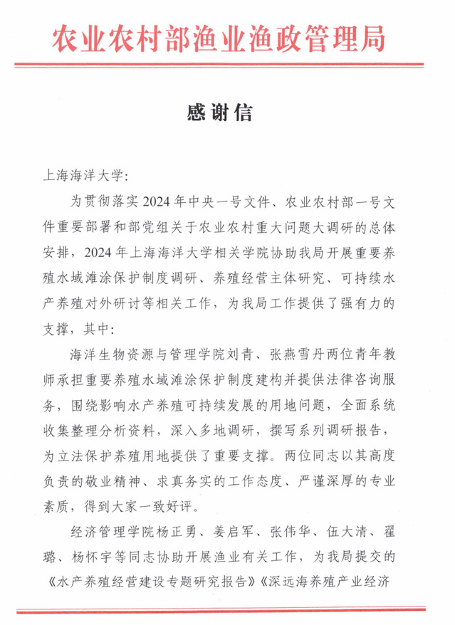近日,公司收到农业农村部渔业渔政管理局发来的感谢信。感谢公司相关公司协助农业农村部渔业渔政管理局开展重要养殖水域滩涂保护制度调研、养殖经营主体研究、可持续水产养殖对外研讨等有关工作。对集团及304永利集团刘青、张燕雪丹同志,经济管理公司杨正勇、姜启军、张伟华、伍大清、翟璐、杨怀宇等同志以及水产与生命公司张文博同志一并表示感谢。