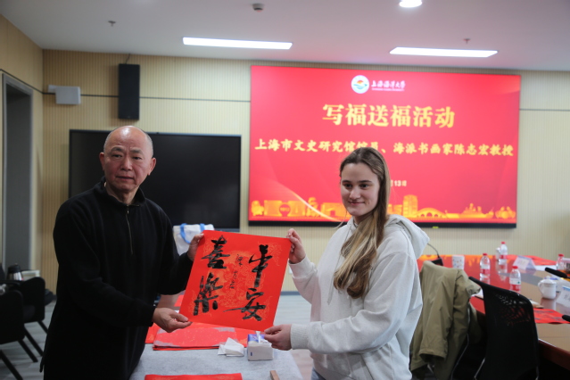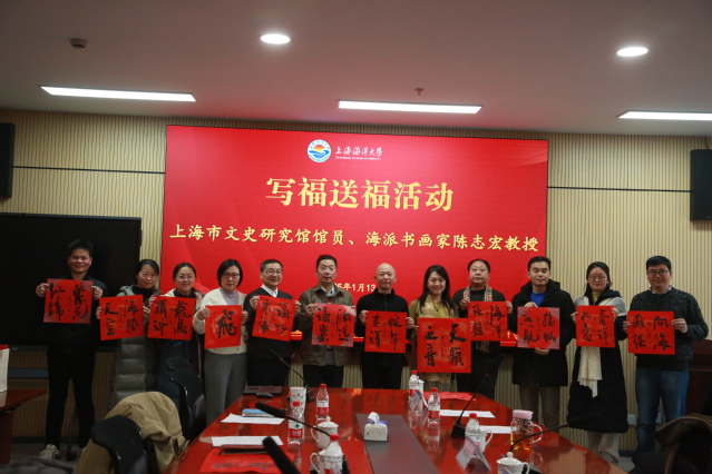 会后,艺术家与师生共同开展了迎新年赠福字活动。陈志宏现场为在场师生讲述了中国的书画艺术、帮助和指导中外员工学写书法。师生们在红纸上写上“海洋强国”“向海图强”“文鳐现世 五谷丰登”“扬帆起航”等内容,共同祝愿伟大的祖国繁荣昌盛,祝愿公司的发展蒸蒸日上。