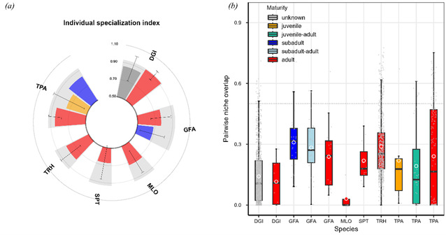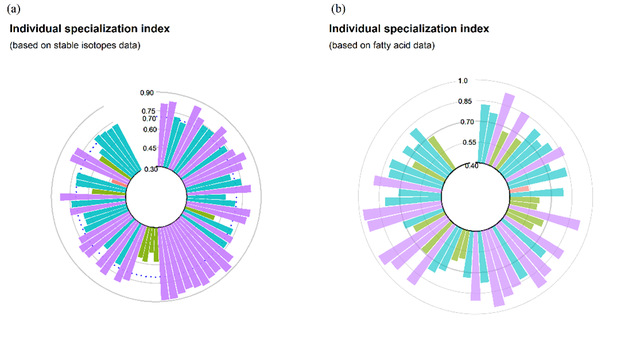 图a示基于稳定同位素分析的个体食性特化指数;图b示基于脂肪酸分析的个体食性特化.