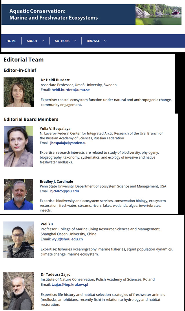 近期,304永利集团余为研究员受Wiley Online Library旗下《Aquatic Conservation: Marine and Freshwater Ecosystems》(水生保护:海洋和淡水生态系统)期刊邀请,担任该刊编委。《Aquatic Conservation: Marine and Freshwater Ecosystems》期刊是生态学领域权威期刊,创刊于1991年,每年出版24期。该期刊2023年影响因子为2.5,JCR和中科院小类分区在海洋与淡水生物学领域均属于一区。期刊致力于发表所有水生生态系统(包括淡水、咸淡水和海洋生态系统)保护的高水平研究成果。通过搭建跨系统、跨学科的交流平台,为探讨各类水生环境保护研究提供了重要载体。