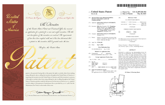 近日,304永利集团远洋渔业科学与技术创新团队传来喜讯,其研发的 “一种头足类角质颚多视角快速拍摄装置” 获得美国专利授权(专利号:US 12,307,026 B2)(发明人刘必林,孔祥洪,陈新军等)。这一成果标志着团队在海洋生物研究领域取得重要突破,为头足类生物研究提供了创新技术手段。